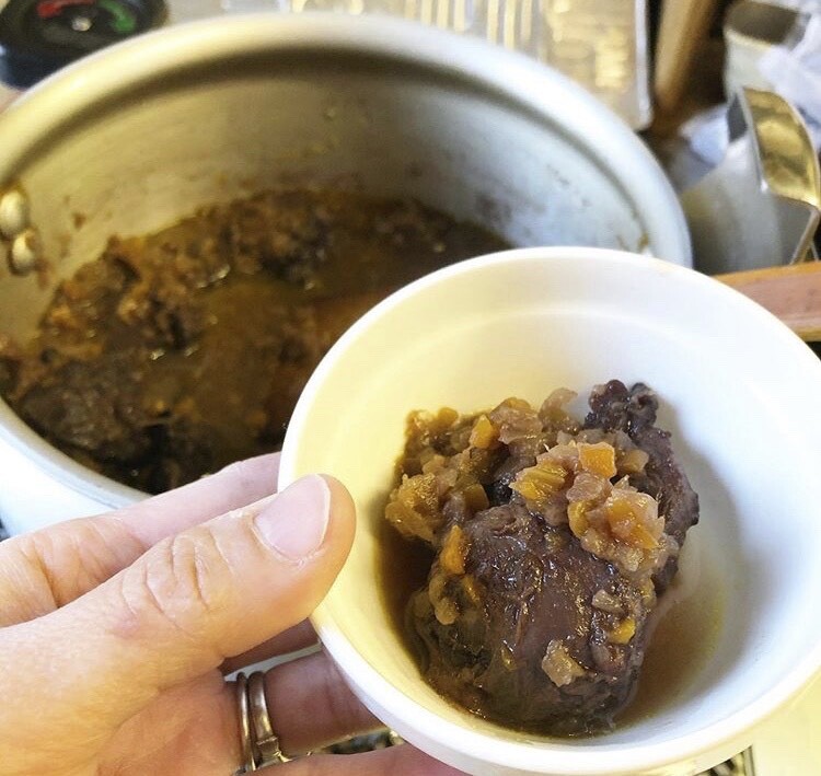 ②イノシシカレースネ肉を圧力鍋で柔らかくしておき、後はいつものカレーに入れて煮込むだけ。