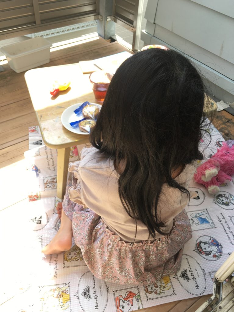 ぬいぐるみを持ち出したり、おやつを食べたりなかなか充実した屋外生活?を