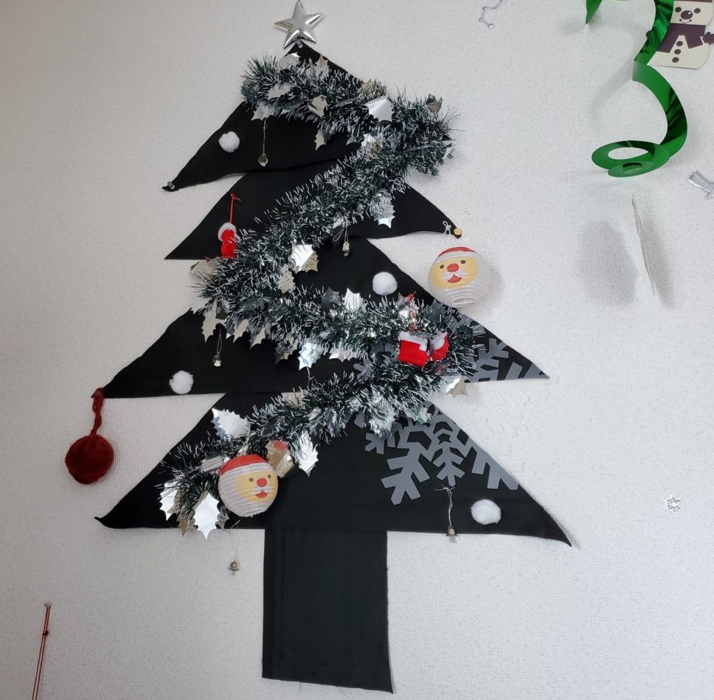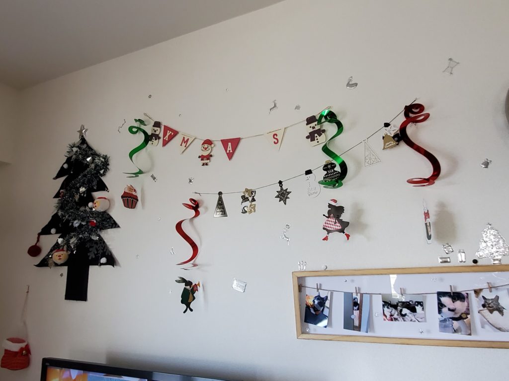 私の家は猫が沢山いて、実物のツリーを置くと危険なのでこういう形で飾ってみました。