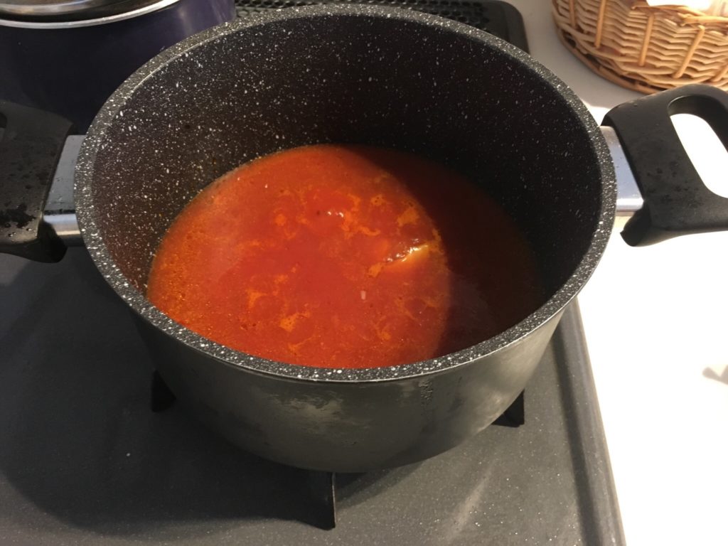 水・トマトソース・コンソメを入れてひと煮たちさせます。