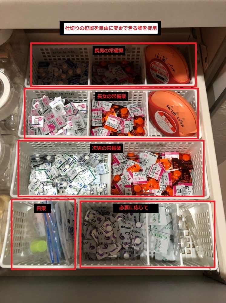 鼻炎とぜんそく持ちの我が子たち:毎日の薬は、子ども別に種類分けをして収納しています。「薬を飲んでね」の声掛けだけで、あとは「自分達でする」。(錠剤の収納ポイントは「1回分で切り離す」です★)