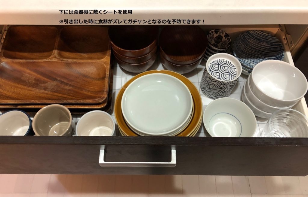 子ども達も手が届きやすいキッチン背面のカップボードの引き出しに収納