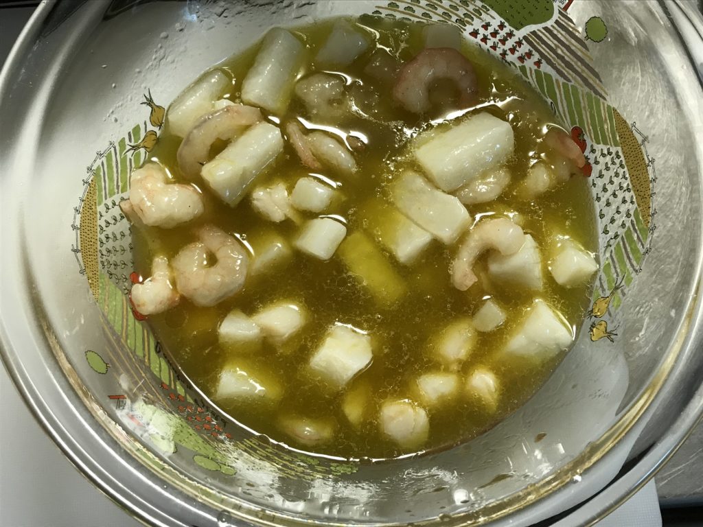 ・マリネ液用の材料を大きめのガラス製のボウル等に混ぜておく(レモン汁・オリーブオイル・ワインビネガー)