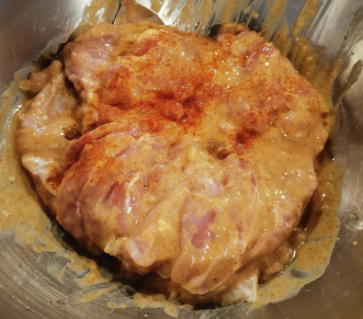 皮を取り除いた鶏もも肉を、すりおろしたにんにくと調味料をあわせたものに1時間ほどつけておく。