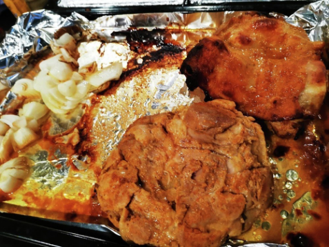 ②200度のオーブンで60-90分焼く。焼けたら竹串を外して鶏肉と玉ねぎを一口大に切る。