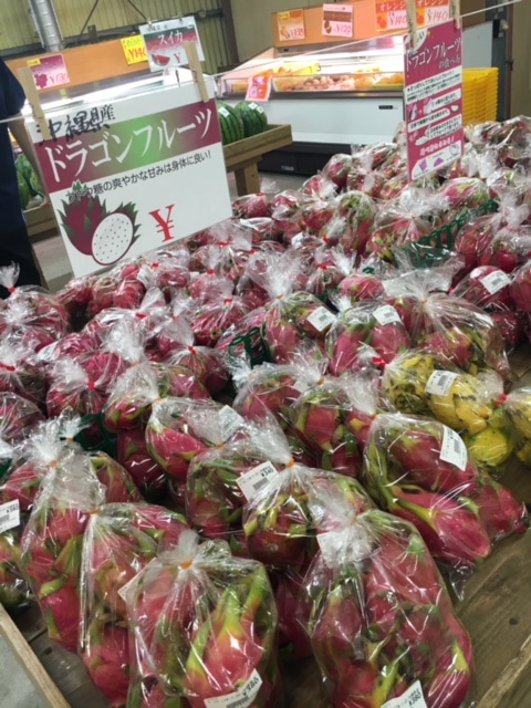 赤のドラゴンフルーツと黄色のドラゴンフルーツが所狭しと並んでいます。