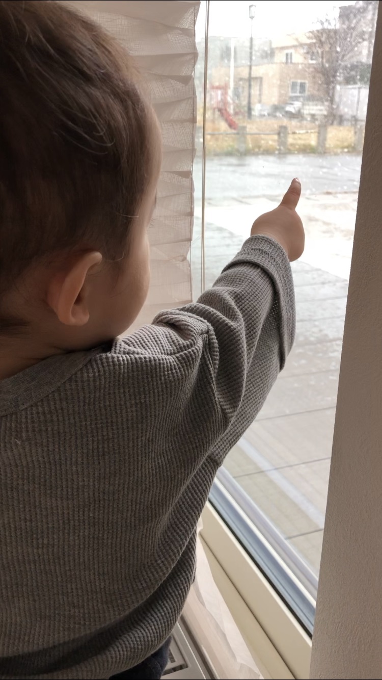 最近よちよち歩き始めた息子が窓の外に降りしきる雪を