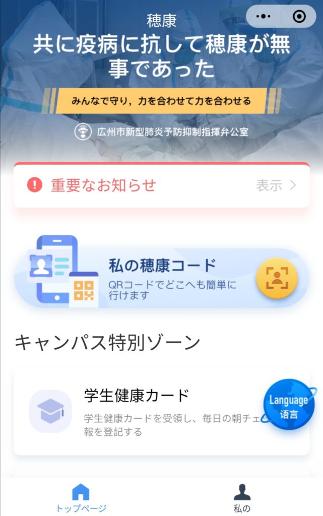 正門にある自動体温測定・消毒システムを通過してから教室に入ります。