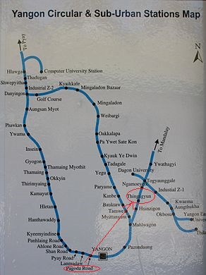 ヤンゴン中央駅で乗り換えが必要です。