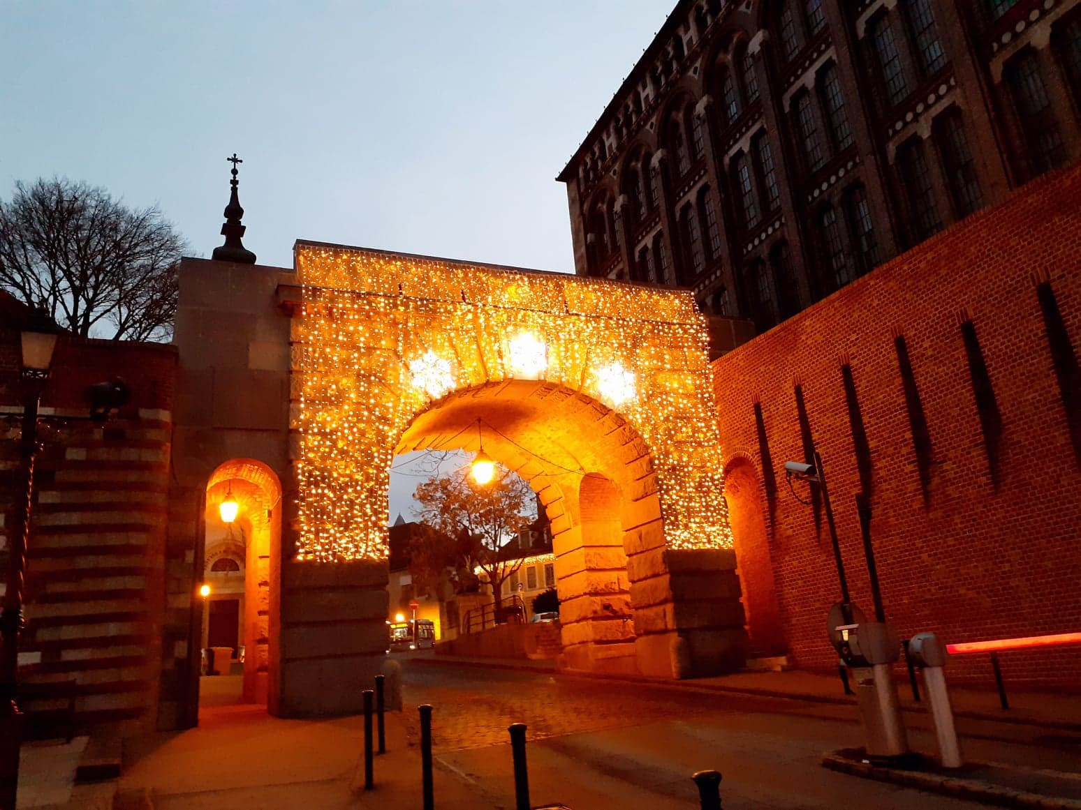 門をくぐると城下街になっていて、アパートやミュージアム、お店屋、レストランもあり、ところどころにバス停があります。