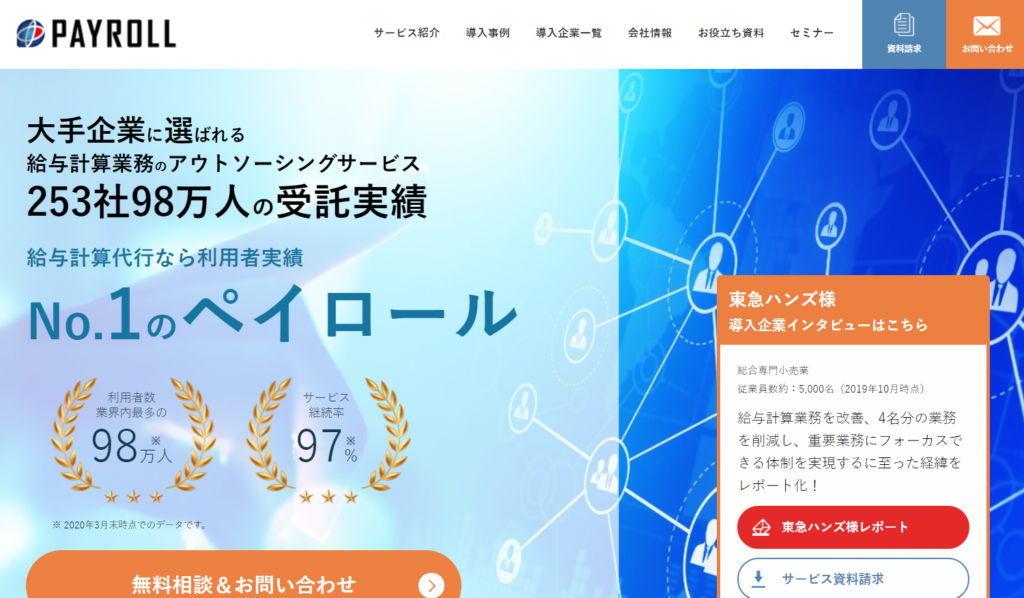 実績93万人、継続契約率97%を誇り、給与計算業務専門アウトソーシング企業としてトップクラスの処理実績をもつ給与計算代行業者です。