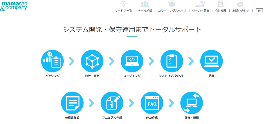 Mamasan&Companyでは、システム開発業務をスピーディーでハイクオリティな開発業務をお任せすることが可能です。大規模なシステム開発に携わったことのある経験豊富なワーカーが多く、環境整備から開発業務、アフターフォローまで一括して請け負うことが可能です。