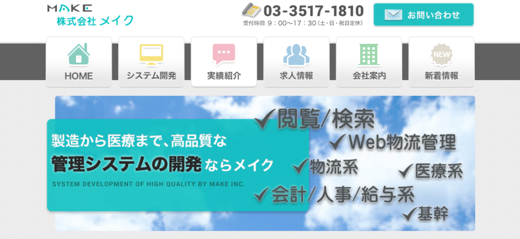 株式会社メイクは複雑なシステム開発を得意とし、豊富な知識で大手企業からの依頼が多く信頼度が高い会社です。特に会計管理やWebサービスなどの専門分野におけるシステムの質が高く、効率よく開発が可能で、コストが格安になるというメリットがあります。