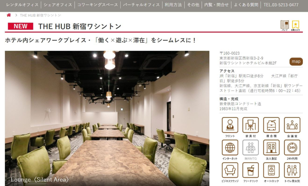 コワーキングスペースの利用のみでも、複合機や会議室、ビジネスラウンジやフリードリンクが利用でき、様々な場面でのビジネスへの活用が期待できるコワーキングスペースです。新宿ワシントンホテル内に立地するだけあり、優れたホスピタリティを有し、落ち着いた雰囲気の仕事ができるお洒落なラウンジやすっきりとした個別ワークスペースも魅力です。