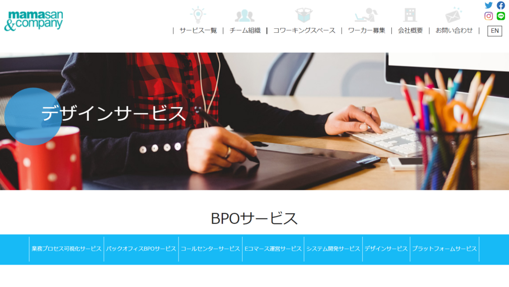 BPO業務(経理・総務・人事・秘書など)に幅広く対応しているMamasan&Companyは、その独自の体制とノウハウを生かしてクリエイティブ業にも力を入れています。専任の体制ではなく、業務に対して複数名のチームを組んで全体の管理をおこないながら進めていく形が特徴で、内容もコンサルタントとともに綿密な打ち合わせが可能です。