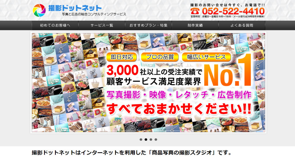 インターネット上にある「商品写真の撮影スタジオ」をうたう撮影ドットネットは、プロのフォトグラファーによる商品撮影のほか、フォトレタッチ(画像処理)などを取り扱っています。トリミングや色調補正といった基本的な加工はもちろん、電線の消去、デジタル移植、デジタルメイクなども対応が可能です。