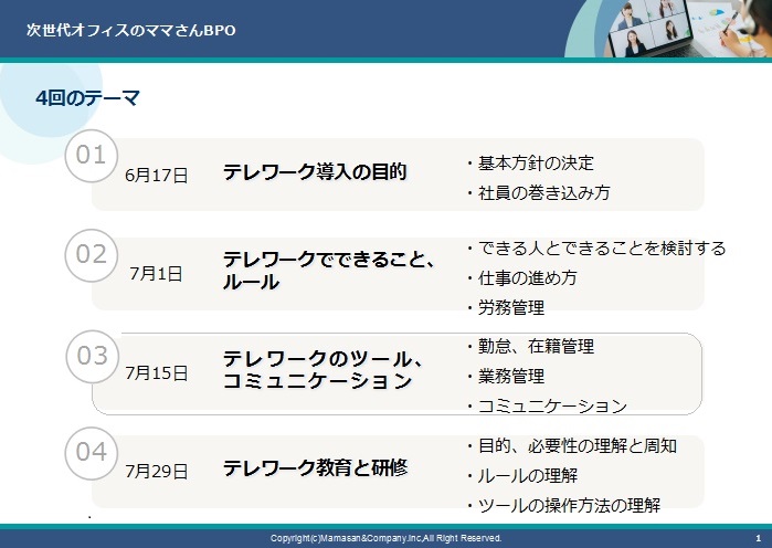 7月1日(水)、Mamasan&Companyテレワーク導入WEBセミナー第2回が行われました。