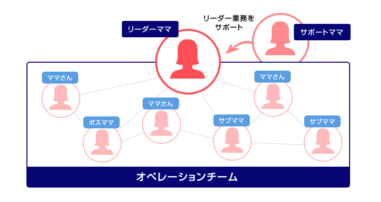 また、前述のピラミッド構造のチームとは別に案件に応じて「リーダーママ」と「サポートママ」を選抜します。