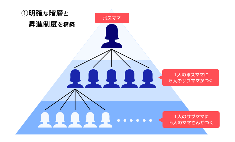 Mamasan&Companyでは、3つの階層に分けた昇格制度を構築しており、上部階層のママさんが下層階層のママさんをフォロー、マネージメントしています。