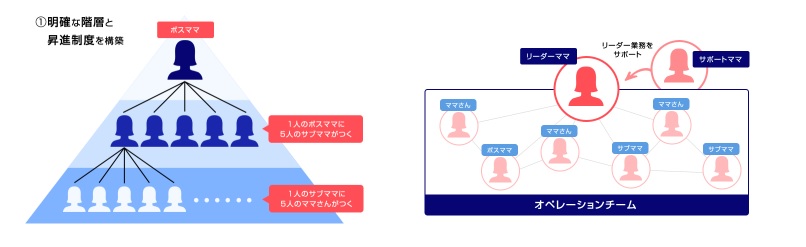しかしMACでは、在宅ワーカー同士でチームを形成し(ボスママ・サブママ・一般ママ)、案件(お客様)ごとにオペレーションチーム(リーダーママ・サポートママ・オペママ)を構築して業務を進めています。